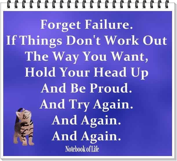 201210/29 Try Again Uncategorized Admin Forget Failure. If things don’t work out the way you want, hold your head up and be proud. And try again. And again. And again. ~Unknown Comments comments