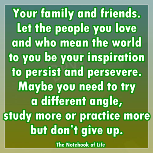 201211/04 Let the people you love Life Quotes Admin Your family and friends. Let the people you love and who mean the world to you be your inspiration to persist and persevere. Maybe you need to try a different angle, study more or practice more but don’t give up. ~Unknown Comments comments